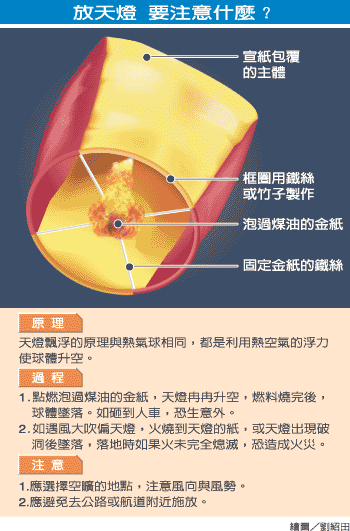 四、天燈原理、過程、注意圖解:(繪圖:劉紹田 記者阮南輝/台北縣報導)